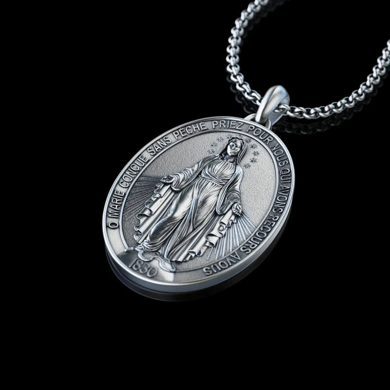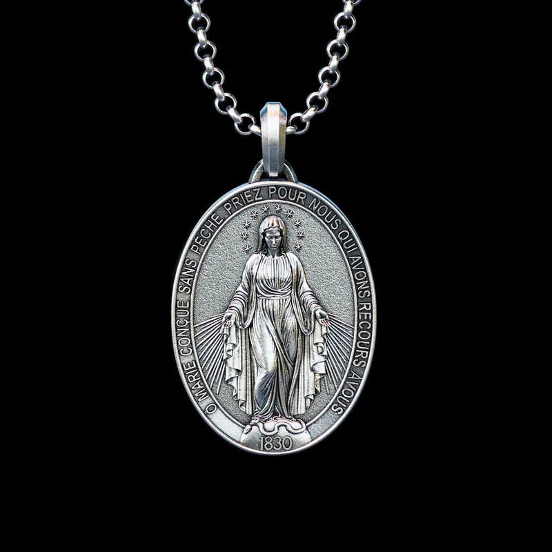 Medalla de la Virgen Milagrosa es un símbolo poderoso de protección y fe. Hecha con materiales de alta calidad, esta medalla presenta una imagen detallada de la Virgen María, rodeada por las palabras "OH MARÍA, SIN PECADO CONCEBIDA, RUEGA POR NOSOTROS QUE RECURRIMOS A TI".🌟